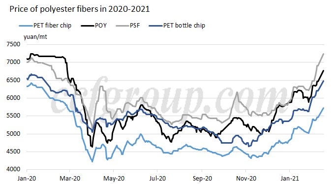 Polyesterfiberselskaper har diskursiv kraft til å markedsføre tilbud når lagerbyrden ikke er høy, råvarekostnadene er høye, nedstrøms utvinning er jevn og nedstrømskapasiteten forventes å øke i første halvdel av 2021. Faktisk har prisen på polyesterprodukter en tendens til å stige i kort sikt da polyesterselskaper er ivrige etter å heve prisen. Støttet av kostnadene, forventes prisene på polyesterfibre å gå tilbake til nivået før pandemien. Prisen på PSF har nådd pre-pandeminivået.